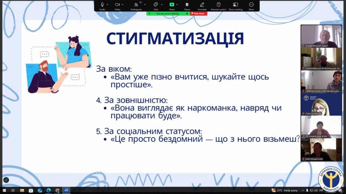 21 травня у межах ініціативи «Година безбар’єрності» начальниця відділу профорієнтації Кіровоградського обласного центру зайнятості Ольга Дерев’янчук провела онлайн-навчання для фахівців обласного центру зайнятості та його структурних підрозділів. Темою зустрічі стала «Комунікація без бар’єрів: як говорити з повагою та розумінням» – питання, що є критично важливим у щоденній роботі з людьми.