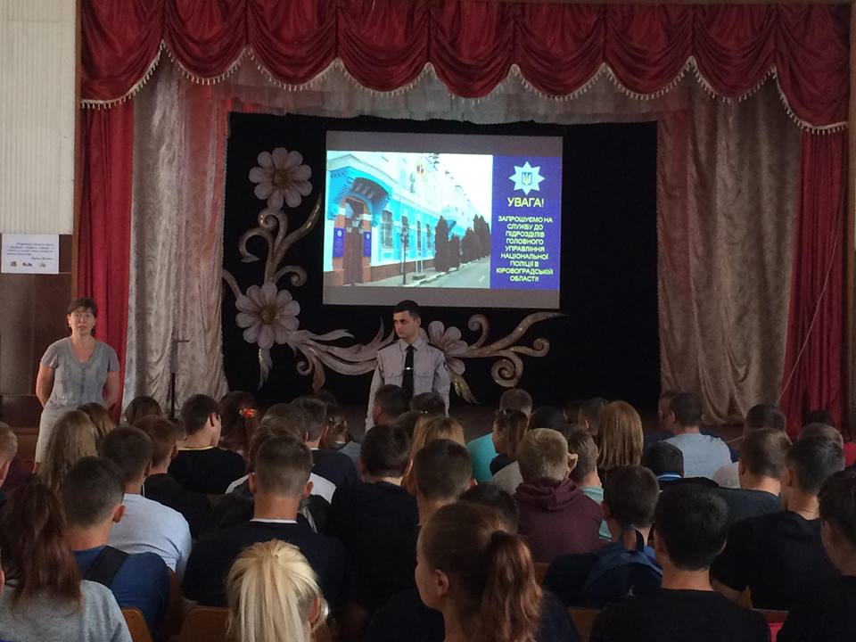У рамках акції «Презентація служби в Національній поліції» днями для студентів професійно-технічного училища міста Бобринець та Бобринецького сільськогосподарського коледжу ім. В. Порика Білоцерківського Національного аграрного університету було проведено презентацію роботодавця – Головного управління Національної поліції в області.