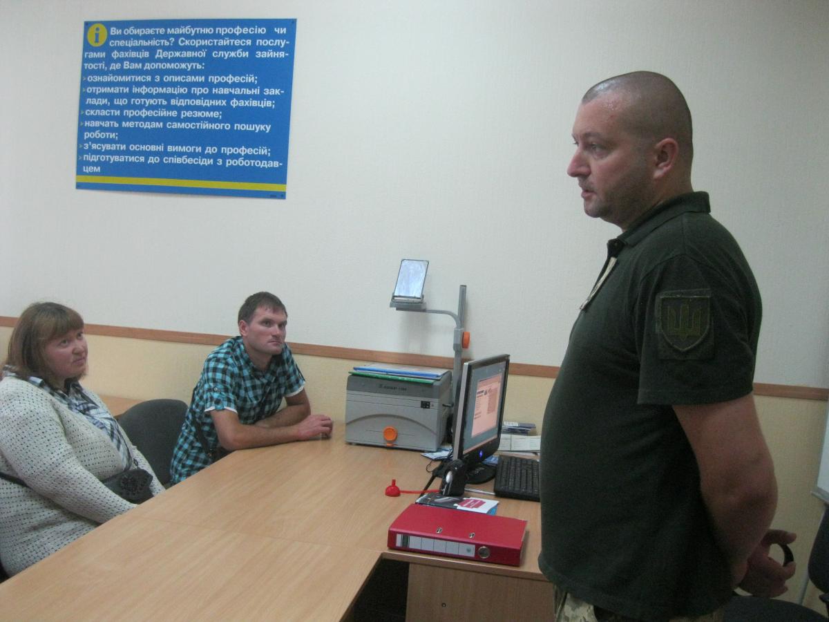 У Новоукраїнській районній філії Кіровоградського обласного центру зайнятості за участі представників районного військового комісаріату систематично проходять інформаційно-просвітницькі заходи з орієнтації незайнятих громадян на військову службу.