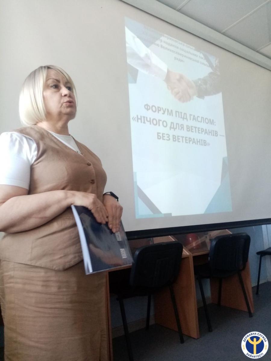 Значну увагу на форумі приділили питанням працевлаштування учасників бойових дій. Директорка Кропивницької філії обласного центру зайнятості Наталія Лисонь детально розкрила інформацію про організацію професійного навчання учасників бойових дій та осіб з інвалідністю внаслідок війни, навчання за ваучерами, можливості учасників бойових дій, осіб з інвалідністю внаслідок війни та членів їх сімей щодо отримання грантів на створення або розвиток власного бізнесу – все це у промові директорки.