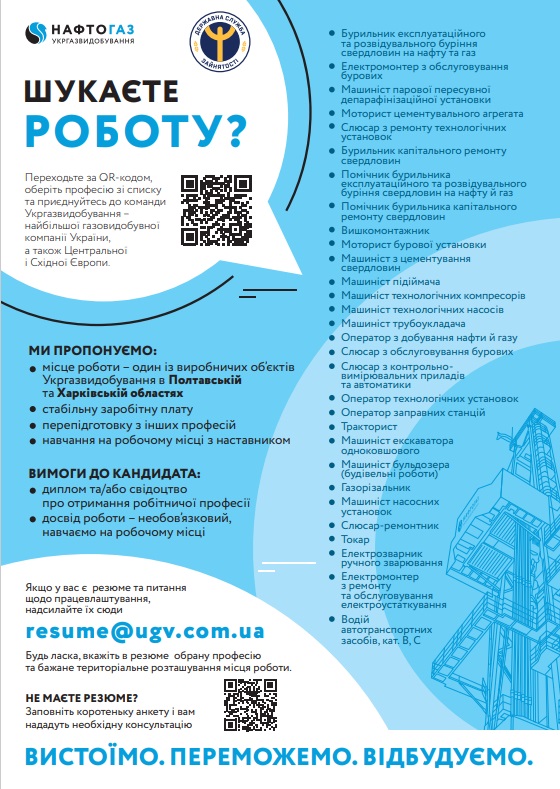 Приєднуйтесь до команди професіоналів найбільшої газовидобувної компанії Укргазвидобування та зробіть свій внесок і розвиток нашої енергонезалежної держави.